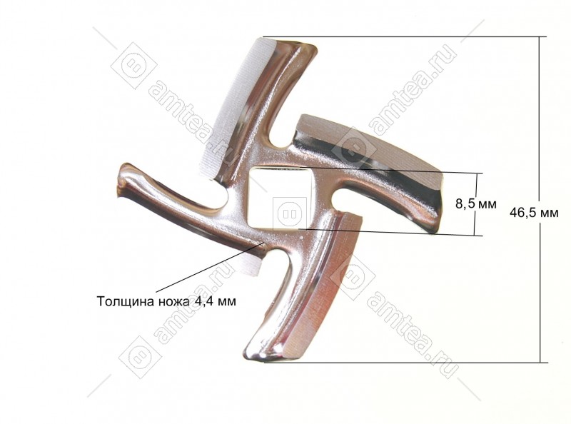 Ширина размаха лопастей 46.5 мм. Сторона внутреннего отверстия 8.8 мм. Толщина ножа 4.4 мм.