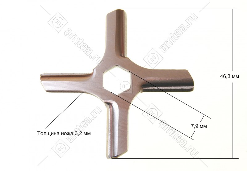 Ширина размаха лопастей 46.3 мм. Сторона внутреннего отверстия 7.9 мм. Толщина ножа 3.2 мм. Отверстие - шестигранник. Подходит к мясорубкам MOULINEX HV3 (A14, A15 - выпуска до 01.01.2000 г.).