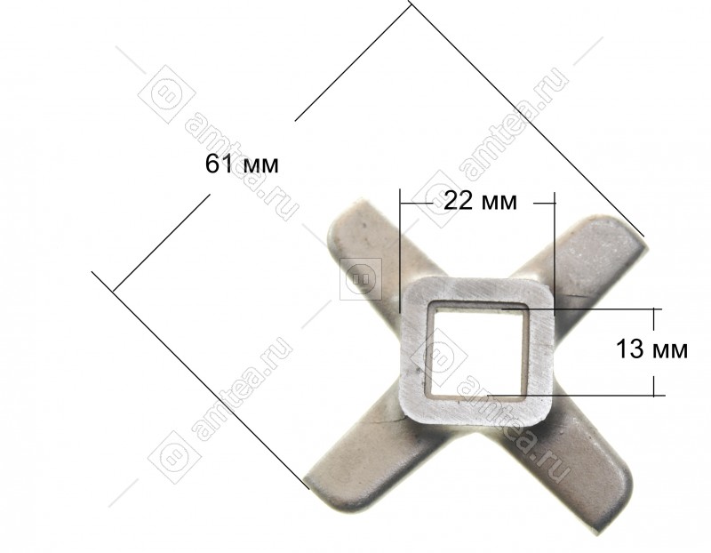 Ширина размаха лопастей 61 мм. Сторона внутреннего отверстия 13 мм. Подходит к мясорубкам Kenwood PRO 2000 EXCEL.